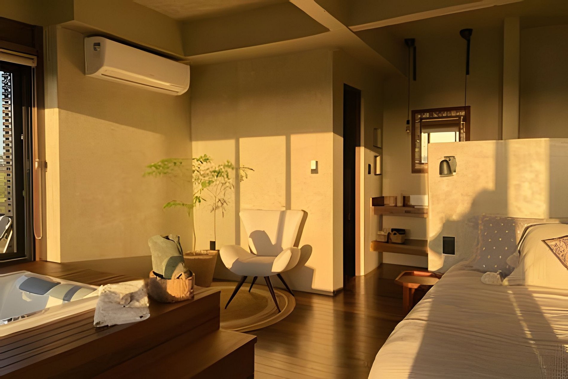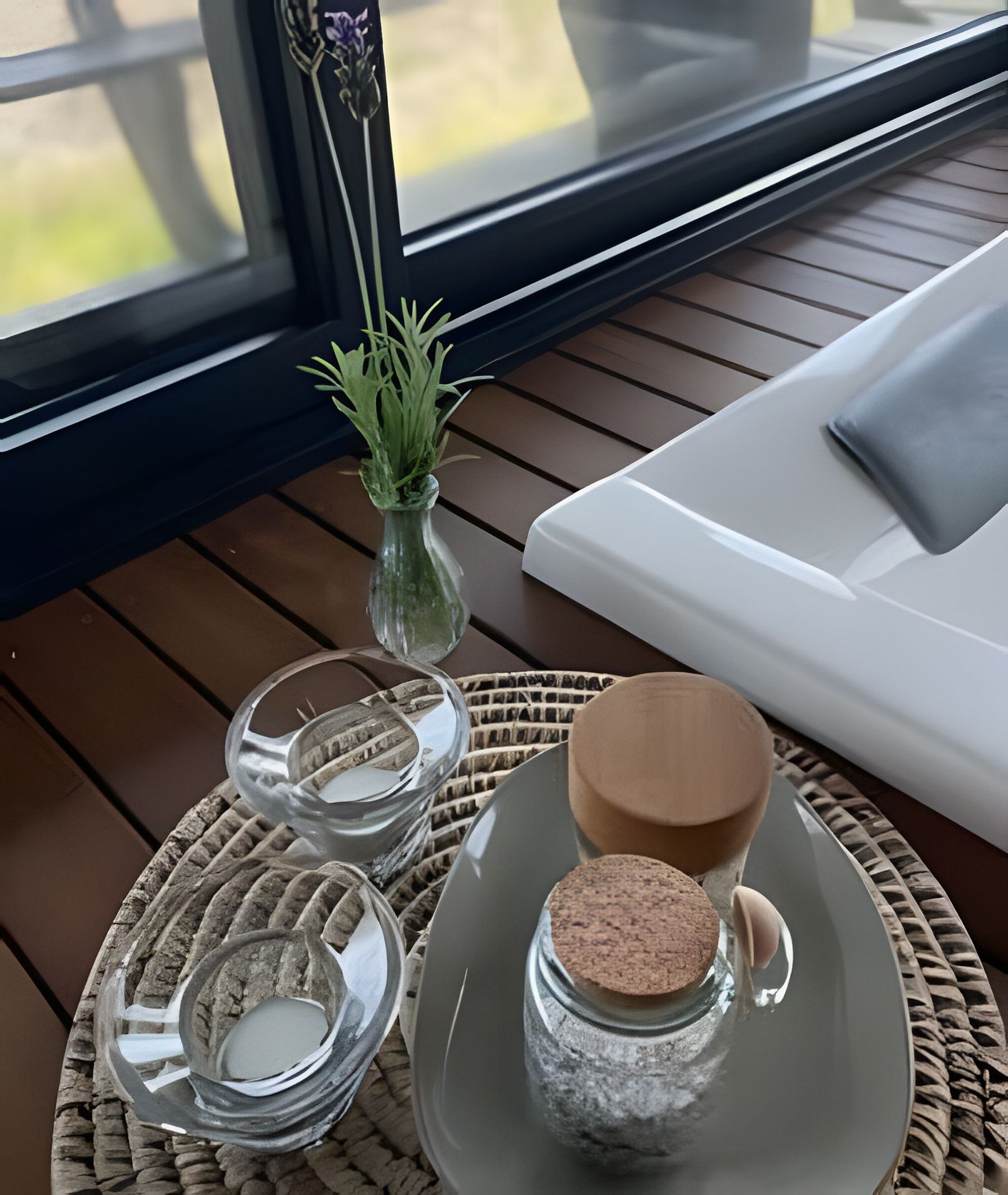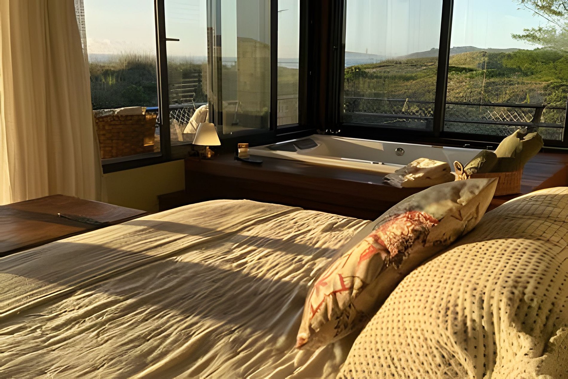 O studio projetado para um casal possui banheira de hidromassagem, cozinha completa, varanda com vista par ao mar, sala de estar, tv, banheiro. Além disso os hóspedes tem acesso ao jardim e área gourmet compartilhados com a casa dos imbês.