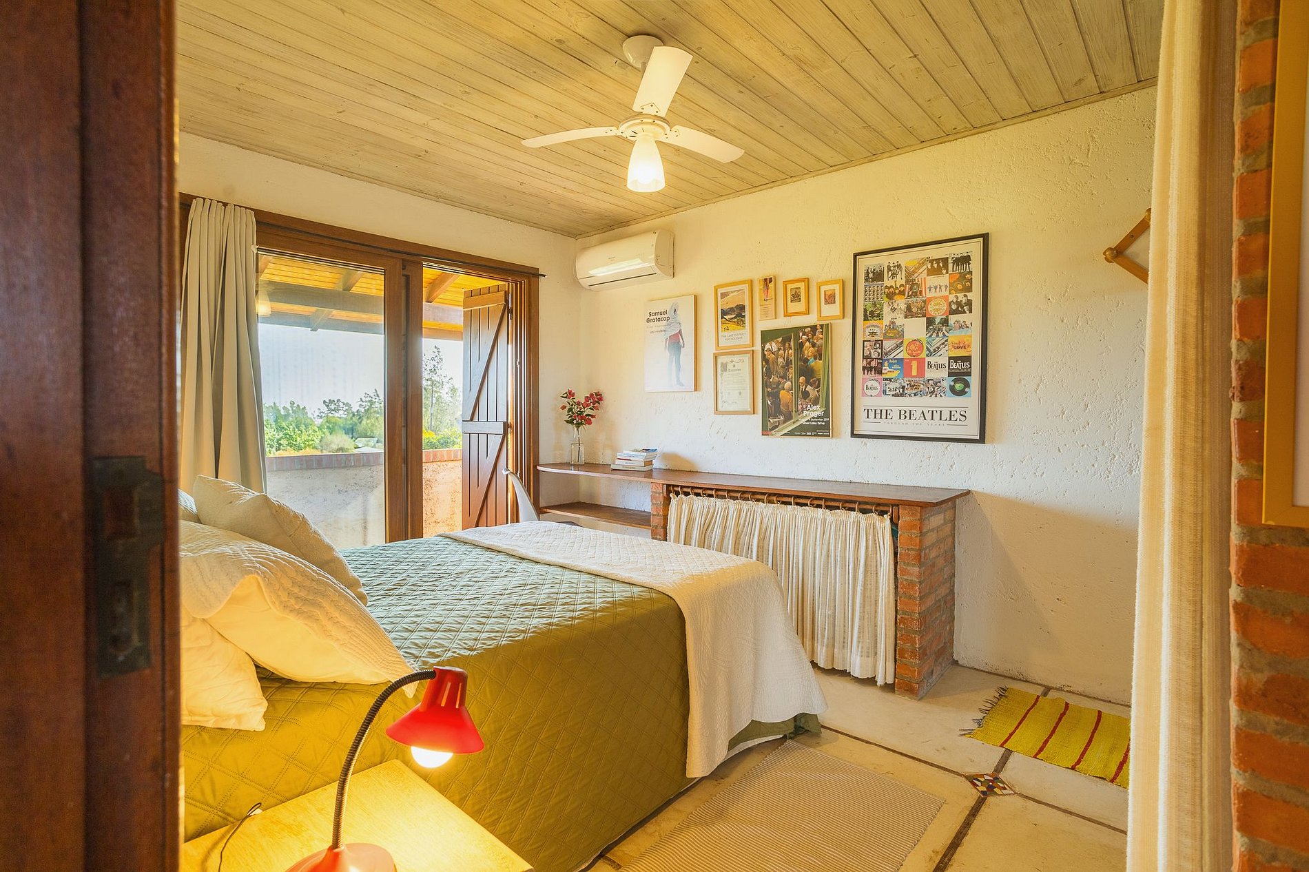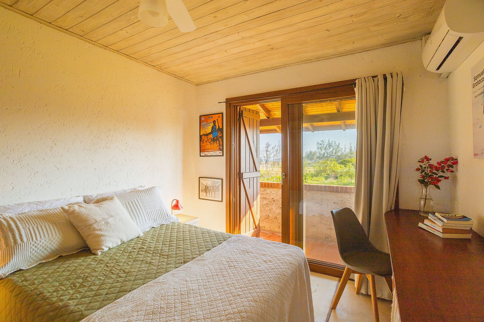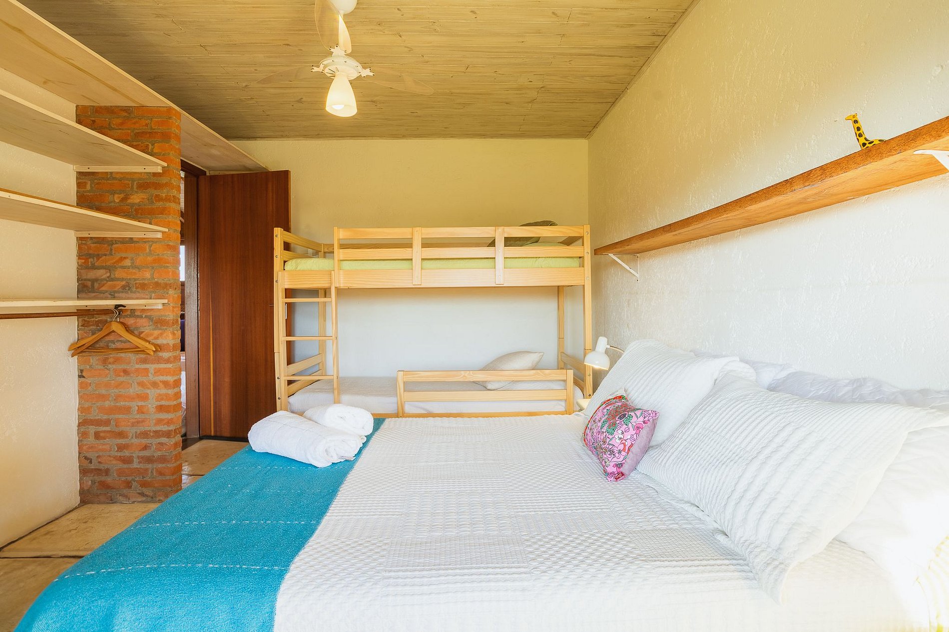 A casa acomoda até 9 pessoas. São 3 quartos com cama de casal e um deles com beliche e bicama, sendo 1 suíte, todos com ar condicionado e dois também com ventilador de teto.