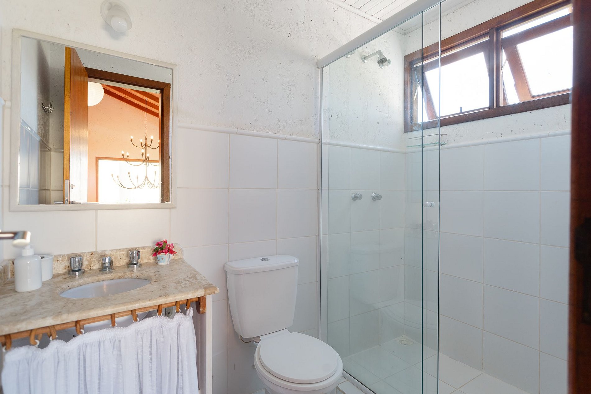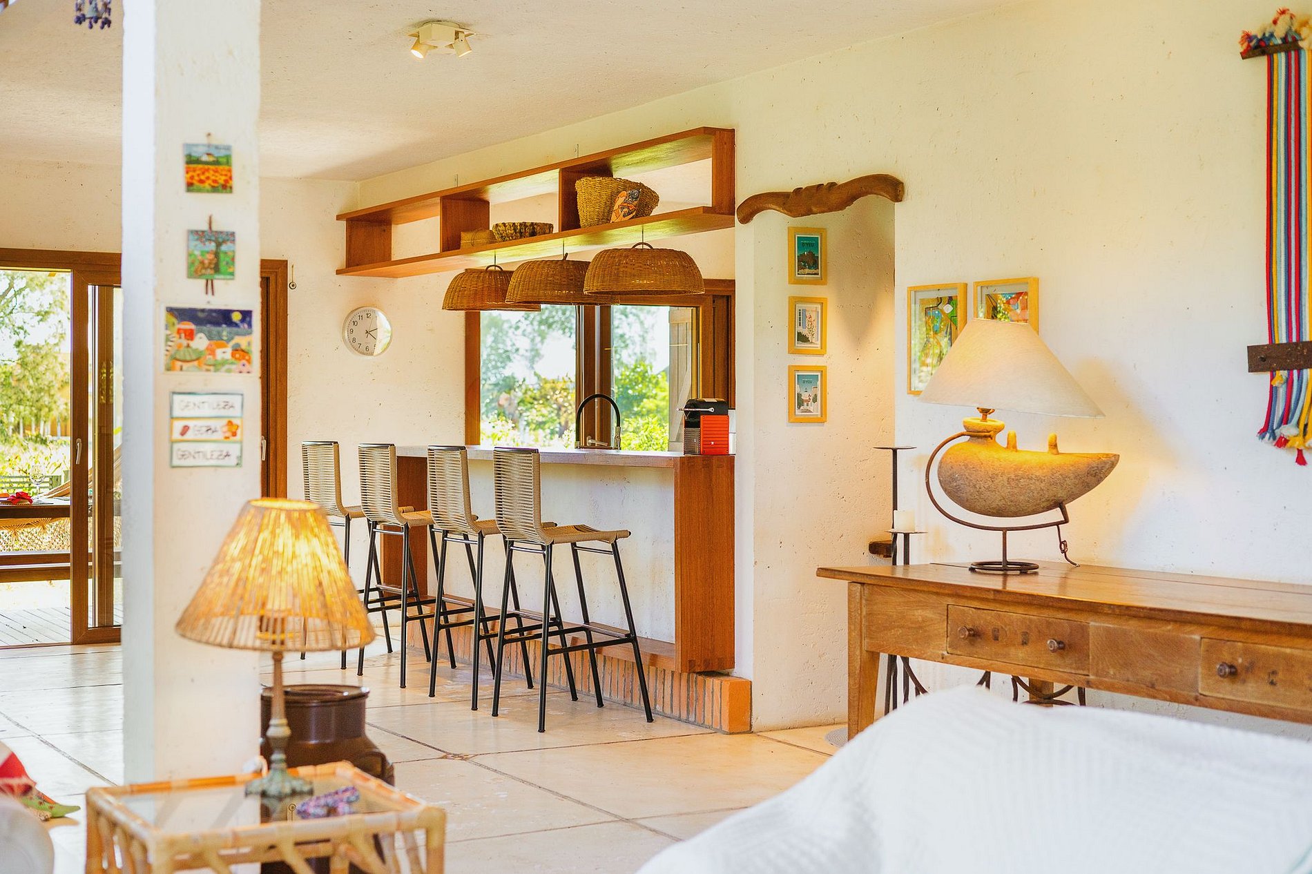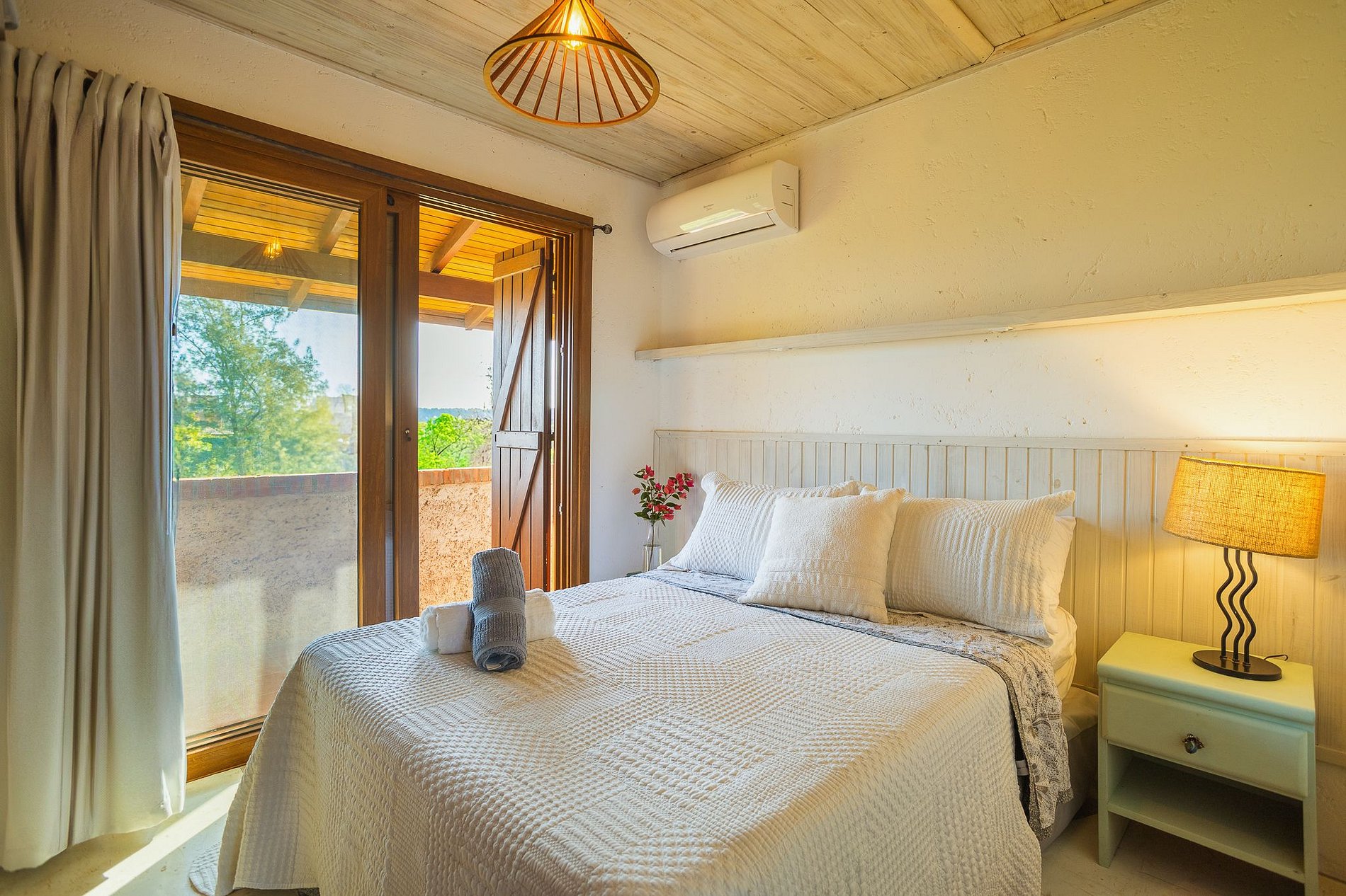A casa acomoda até 9 pessoas. São 3 quartos com cama de casal e um deles com beliche e bicama, sendo 1 suíte, todos com ar condicionado e dois também com ventilador de teto.
