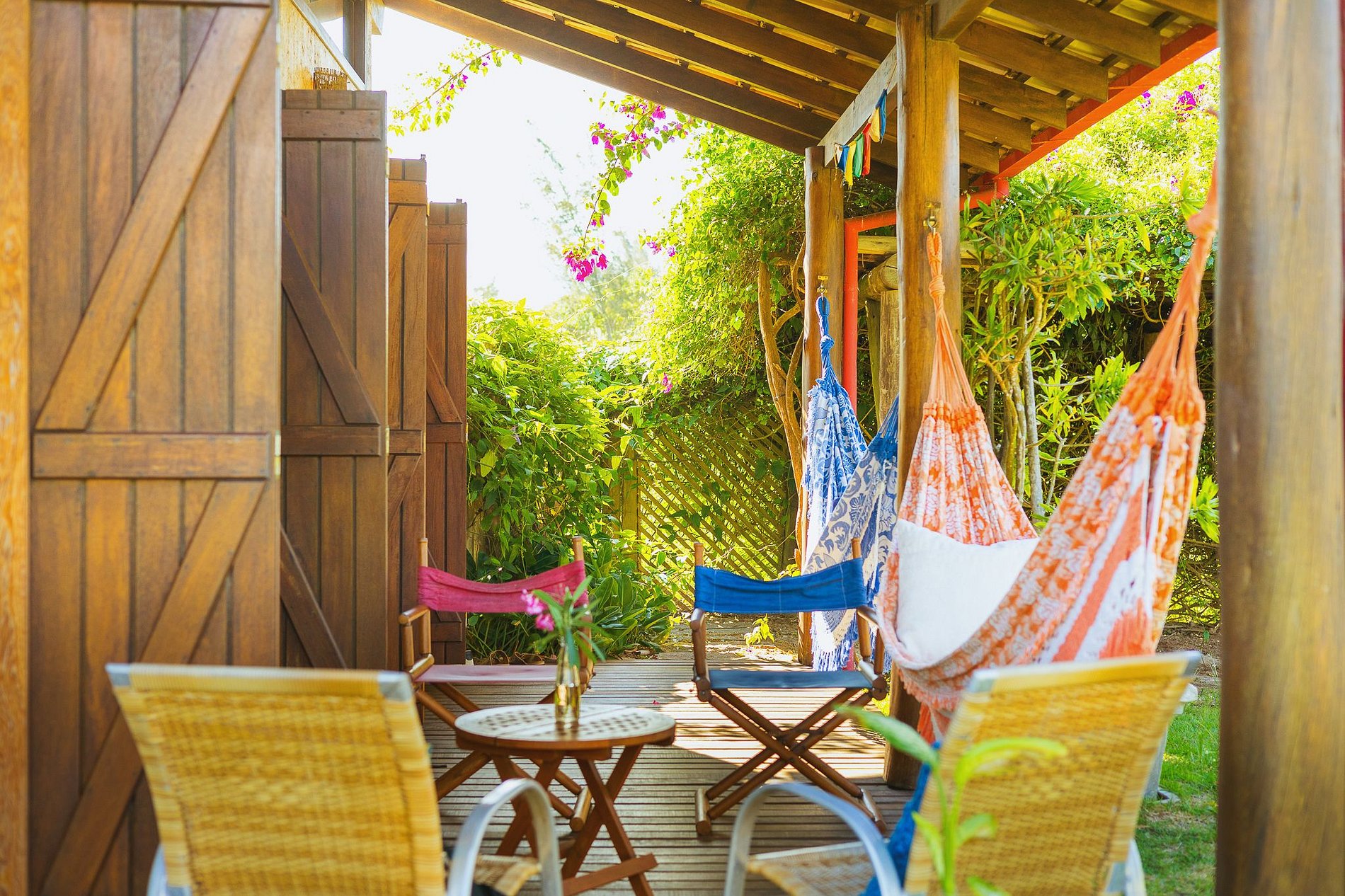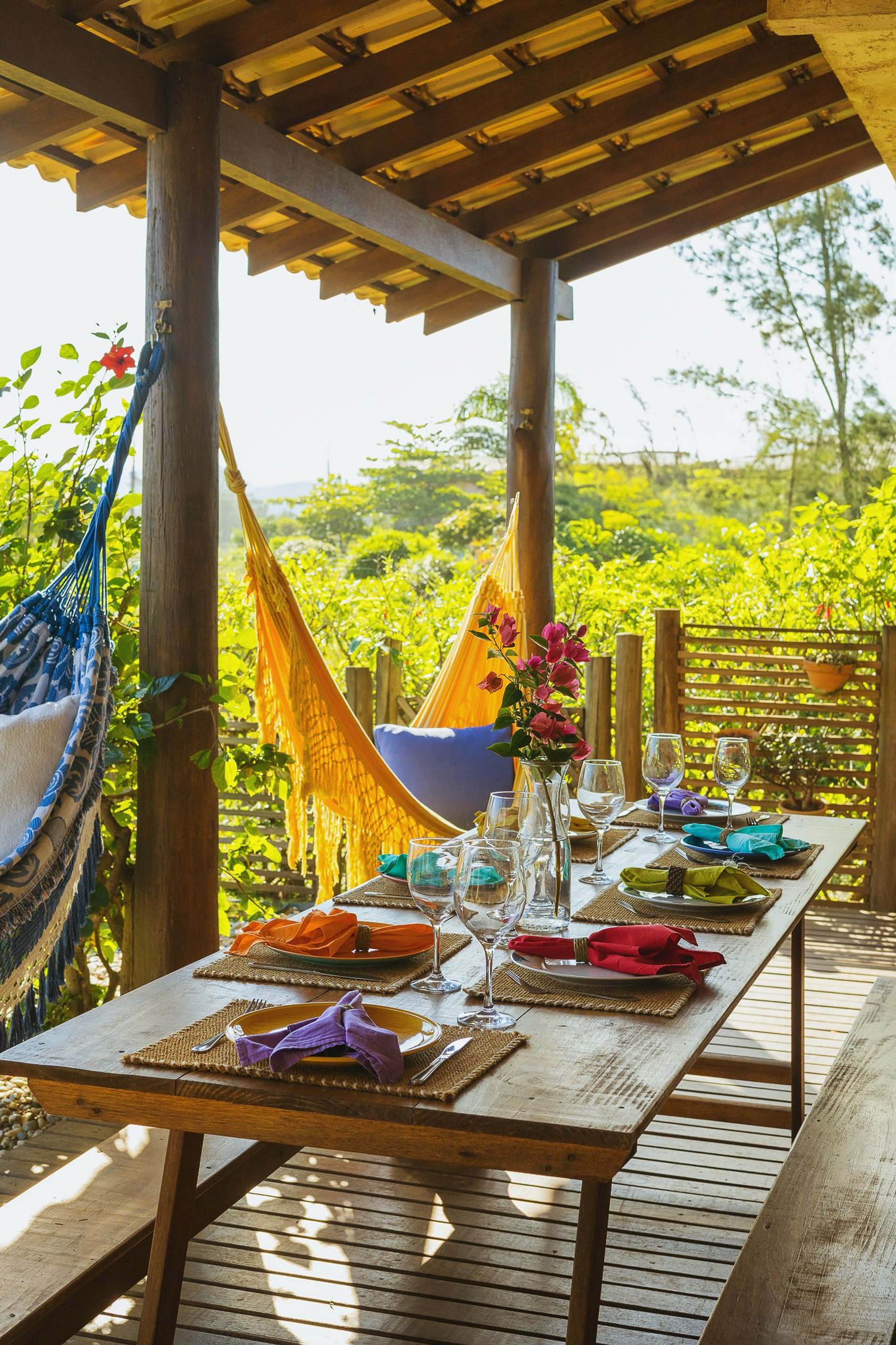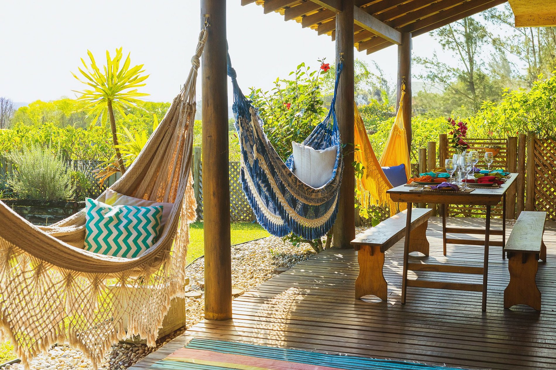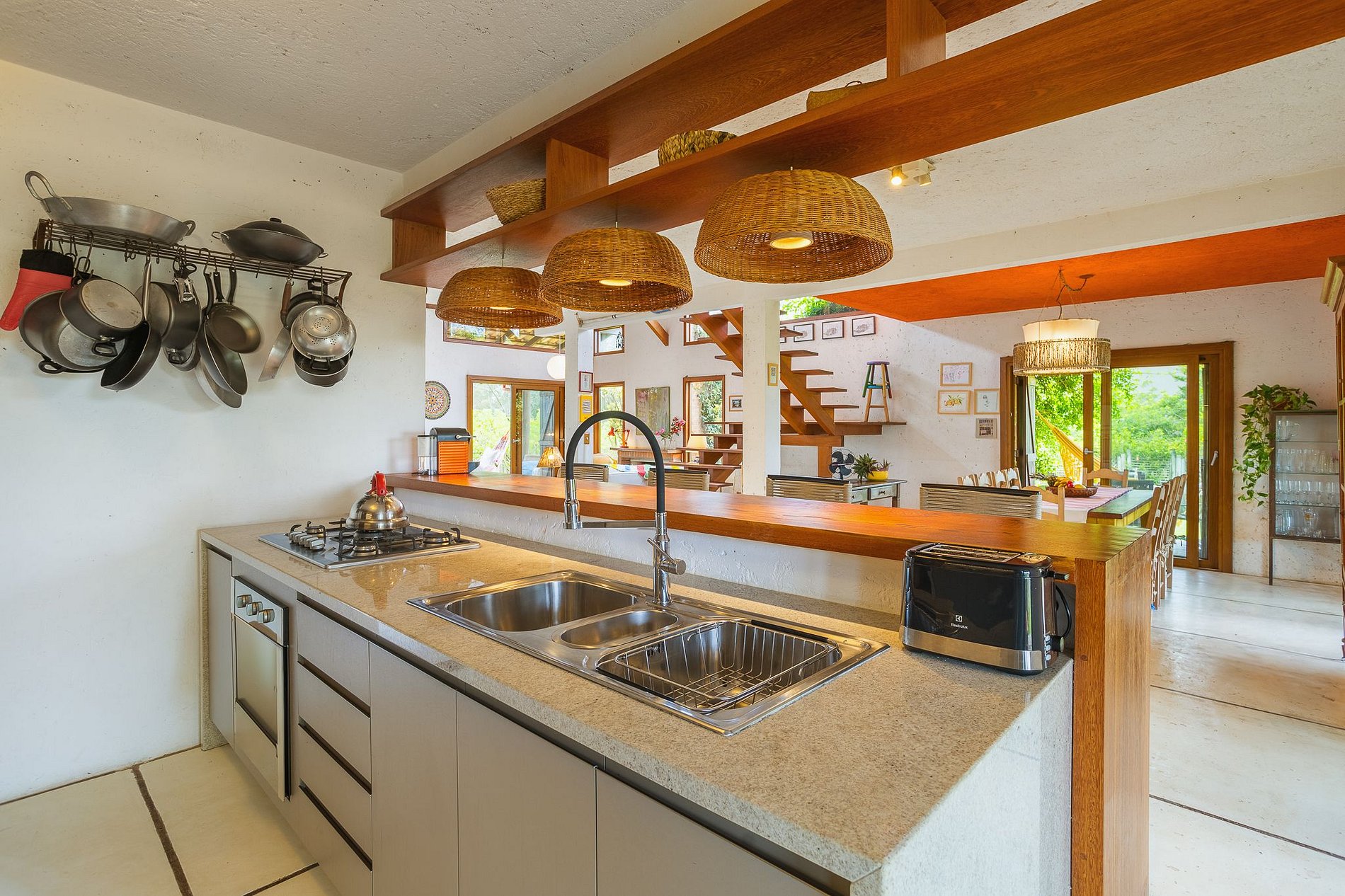 Cozinha completa, espaço com churrasqueira, sala de jantar e estar cercada por varandas espaçosas para curtir nas redes, tomar café da manhã e fazer as refeições ao ar livre.