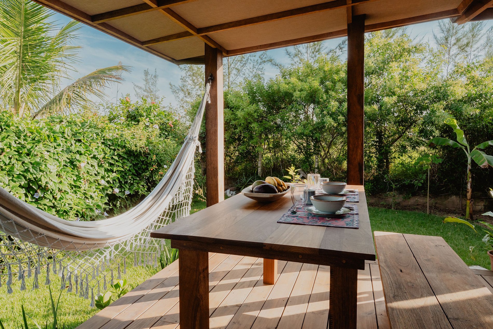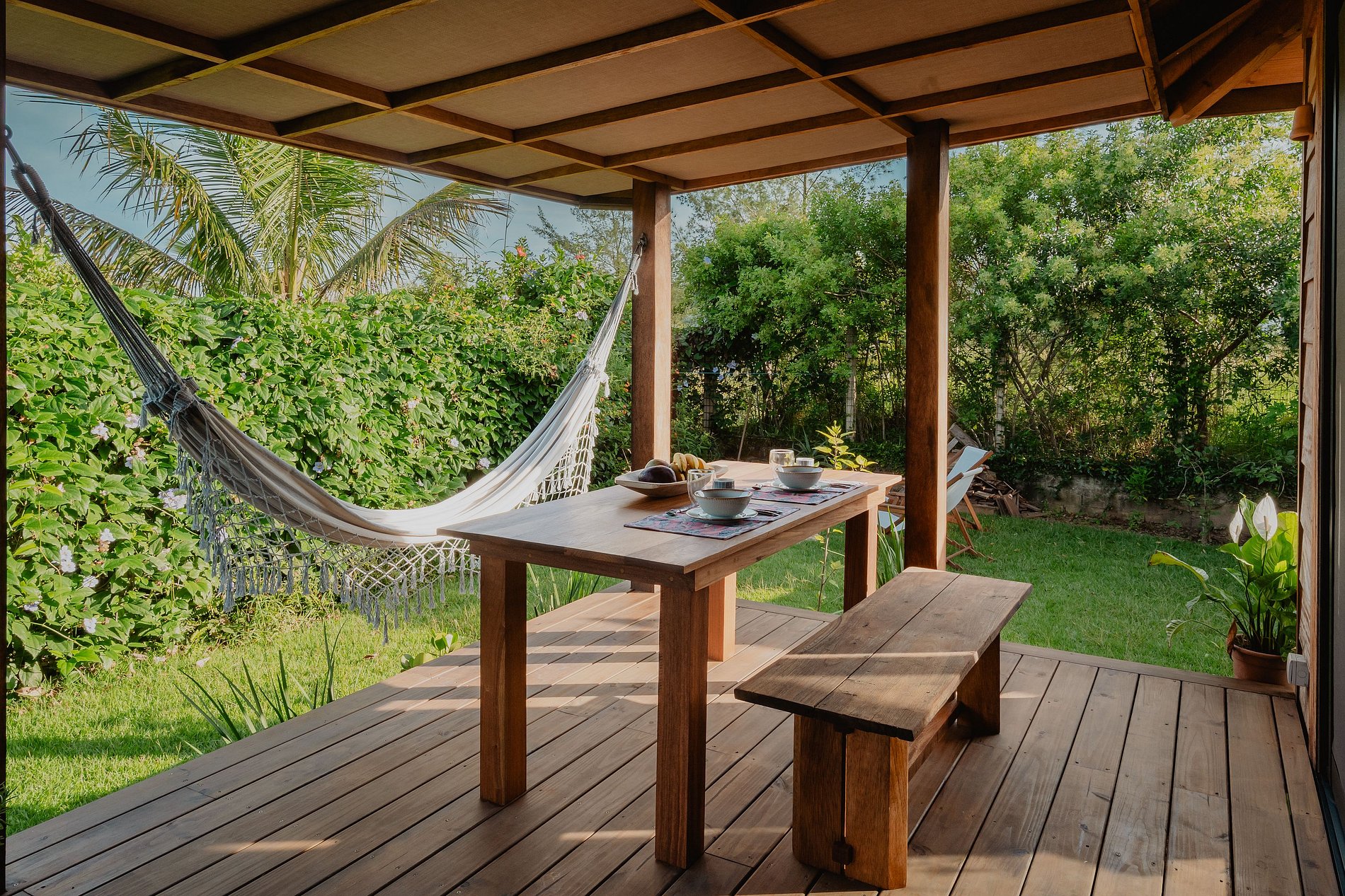 Um jardim zen privativo com total privacidade, chuveirão ao ar livre, rede para descanso e vaga para um carro, a poucos passos da praia.